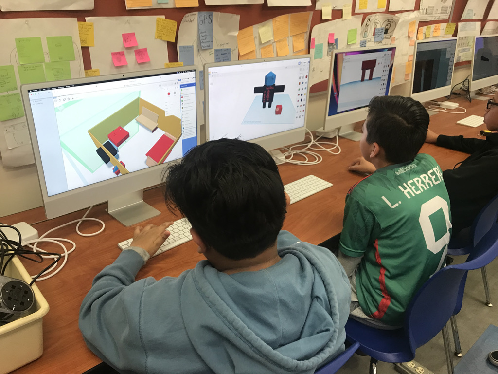 Computer Aided Design (CAD) was another first for all of my students. Here we see students working in Tinkercad. The use of the design process (Empathize, Define, Ideate, prototype, test) was used when students designing in Tinkercad.
